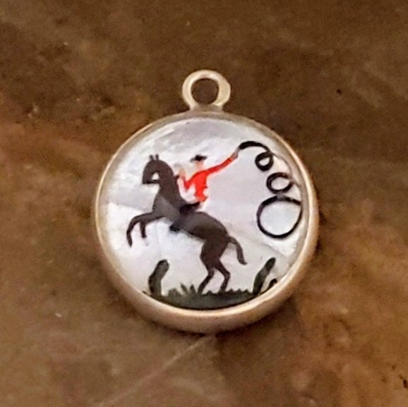 Giddy up and get this beautiful; vintage; round glass cabochon with reverse painted scene of a cowboy on his horse ready to lasso! Reminds me of Toy Story's "Woody" character. Sterling mark is clearly imprinted on the back. In excellent; vintage condition.