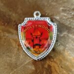 Vintage, Sterling Silver Hollywood charm featuring the iconic Chinese Theater, formerly known as Mann’s Chinese Theatre. Vintage Sterling silver shield with protective resin covering the colorful, featured illustration, the Sterling mark is clearly imprinted on the back. In excellent, vintage condition. Approximate dimensions – 1/2″ wide x 7/8″ high.