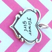 Sterling silver charm with 2D qualities. This heart charm has the words Flower Girl written on it. Approximately 1/2 inch wide.