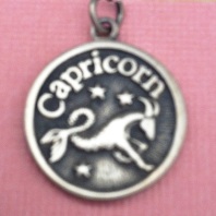 Sterling Silver Capricorn Zodiac Sign Charm with 2D qualities features the goat symbol on the front of the charm and the trait "Ambitious" on the back. Approx 3/4 inch wide.