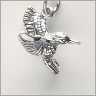 Sterling Silver Hummingbird charm with 2D qualities; approx 5/8 inch long. Flat back.All charms have a complimentary sterling silver split ring for attachment.  If you prefer to have your charms soldered; please let us know that you will need a solde