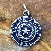This charm is truly unique in that the official State Seal of Texas does NOT include the 3 stars in the bottom border. The 1956 Martinez Act created watercolor of the seal for use on the State National Guard Aircraft. This design was faithful to the constitutional description and omitted erroneous details that had crept into the seal over the years; such as the addition of stars and diamonds in the bottom of the seal's outer ring and the use of post oak leaves instead of live oak leaves.